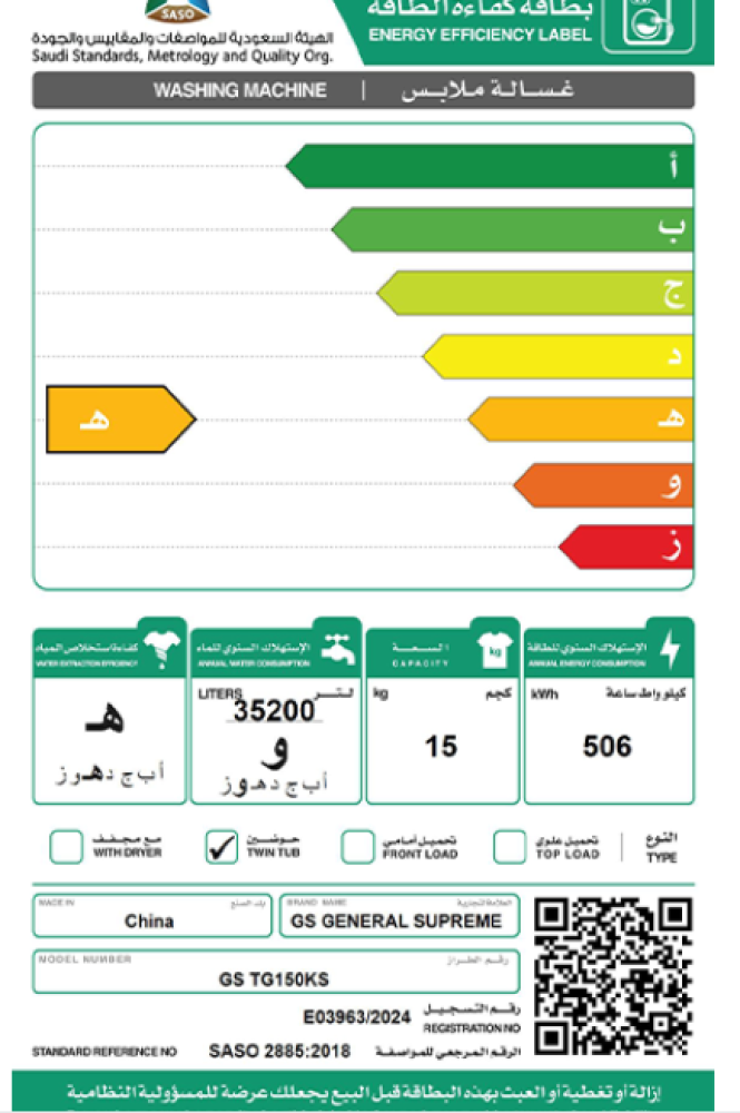 غساله حوضين جنرال سوبريم 15 كيلو ، باب زجاجي مقوي